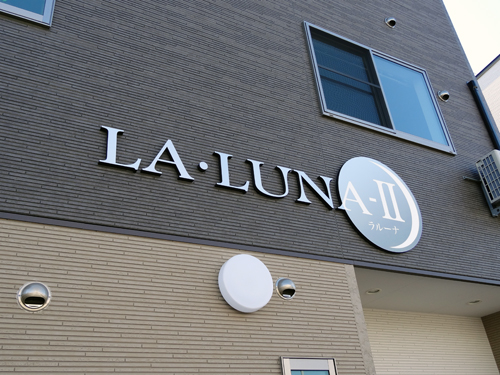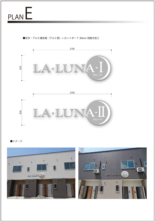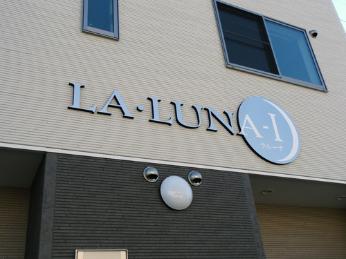 裏面のエアコン室外機の目隠しを兼ねるビジュアルサイン(高さ5mあります)と店名ロゴサインです。